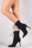 Qupid Vegan Suede Lace Up Pointy Toe Booties