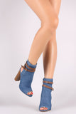 These stylish booties feature a peep toe silhouette, denim upper with wrapped around buckles accent, exposed back, and chunky stacked heel. Finished with a cushioned insole and side zipper closure for easy on/off.