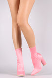 These stylish boots feature a smooth satin upper, pointy toe silhouette, and chunky round heel. Finished with a cushioned insole and side zipper closure.