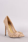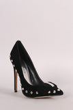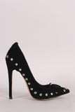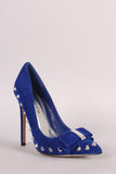 This single sole pump features a vegan suede fabrication, pointy toe silhouette, scoop vamp, pointy studded spikes, bow design, and slim stiletto heel. Finished with a lightly padded insole and easy slide style.