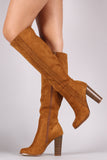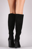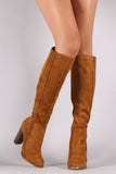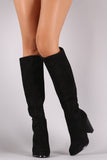 Suede Perforated Trim Chunky Heeled Knee High Boots