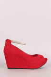 These platform wedges are slip-on style with a metallic ridged ankle strap and slightly elasticized sides. Pump silhouette with its open front and peep toe opening. Finished with an adjustable rear back zipper.