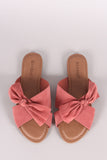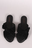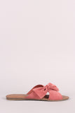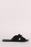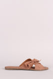 This flat sandal features a wide crisscross vamp strap with a bow design, lightly padded insole, and easy slip-on style.